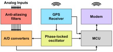 From a design perspective, a phasor measurement unit is a relatively simple data collection circuit. It consists of a microcontroller or microprocessor, surrounded by a 6-channel Analog-to-Digital Converter (ADC) capable of measuring each channel at 1200 ksps or more. There is also a GPS receiver providing a precise and universal time base, a local memory for storing the recorded synchrophasors, and a communication interface for communicating the measured data back to the grid operating room. The analog inputs will need to be protected from harmful voltages by an appropriate protection circuit. However, most of the design can be easily fitted into an embedded system powered at 3.3 V.