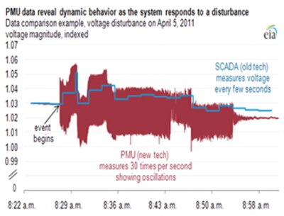 An important grid power-quality monitor is the Phasor Measurement Unit, a versatile monitor that measures the instantaneous voltage, current, and frequency of the electrical transmission lines. In North America where the grid is operated at 60 Hz, AC signals are measured 30 times per electrical cycle, 1200 times per second. The Phasor Measurement Unit calculates phasors based on these measurements, typically 30 phasors or more per second. A phasor, short for “phase vector”, is a complex number representing a sine wave by its amplitude, frequency, and phase. Think of the phasor as a precise measurement of the “heart beat” of the electric grid at the measured location.