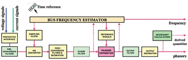The microcontroller receives a filtered analog signal as input to the A/D. These signals are converted at a minimum sample rate of 1200 ksps. The resulting samples are fed into a digital low-pass filter before the phasor calculation starts. The phasor calculation uses a DFT to calculate the magnitude and phase of the signals. This is applied for each phase. Typically, one period of data is used, to reduce the effect of measurement noise. The resulting phasors are then time-stamped using a synchronized time-reference obtained by the GPS system.