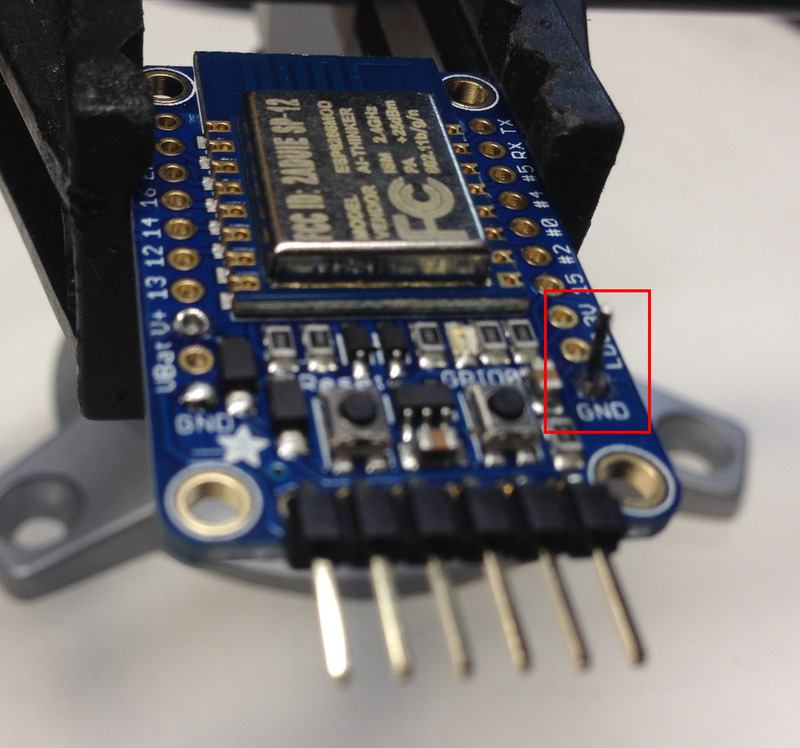 Now connect the MicroUSB breakout. Connect the 5V pin to the header pin going through V on the Huzzah.
