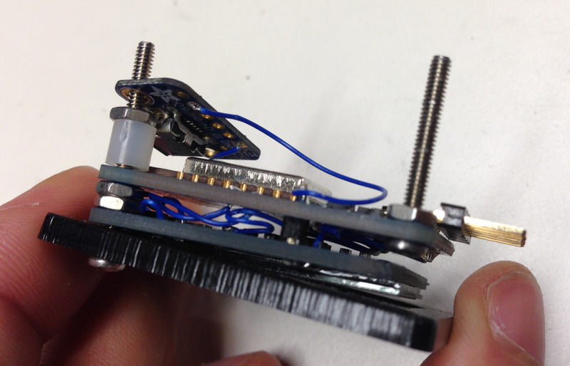 Place the 3/4" screw into the top right hole of the Huzzah breakout. You might need to angle this in to get past the OLED breakout. Tighten down with a hex nut.
