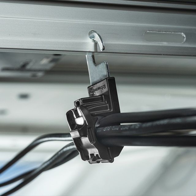 Fits 9x12 or 9x14 module mounting hole for string-level wire management. Convenient LOC quickly secures wires.