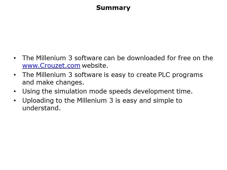 In summary, the Millenium 3 software makes it easy to create PLC programs and make changes. Also, using the simulation mode speeds development time. Uploading to the Millenium 3 is easy and simple to understand. The Millenium 3 software can be downloaded for free on the Crouzet website at www.Crouzet.com.