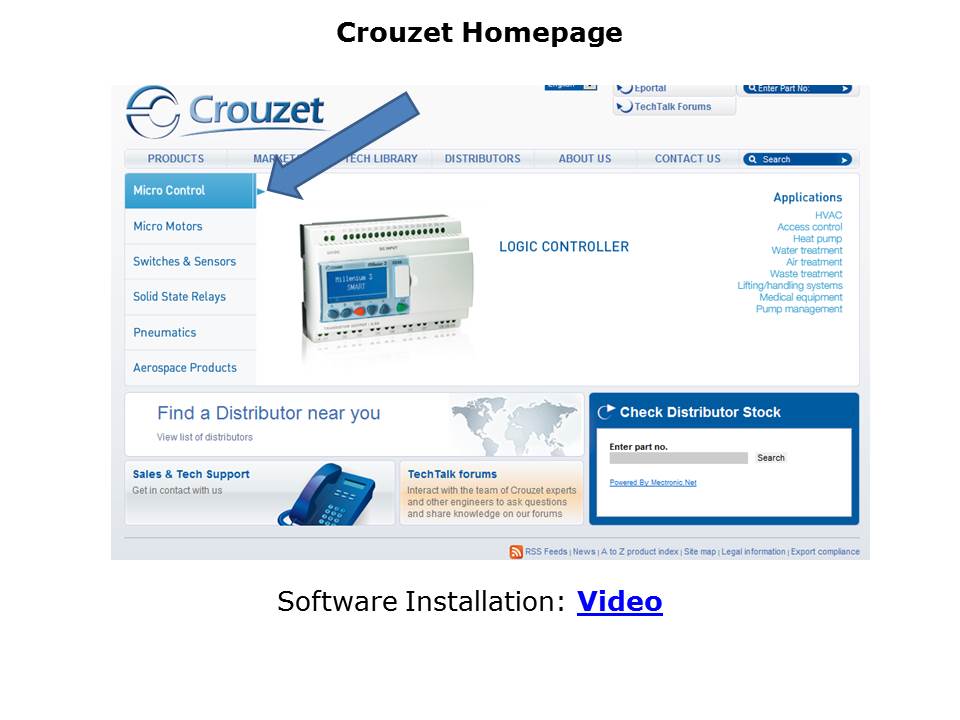 Installing and using the Millenium 3 software is very easy and can be found by going to Crouzet’s website at www.crouzet.com. This is a free and fully functional version of software and will communicate and program all of the Millenium 3 products. The first step in downloading the Millenium 3 software is done by clicking “Micro Control” on the top left side of the Crouzet Homepage. For a full follow along video click the “Video” link on the bottom of this slide.