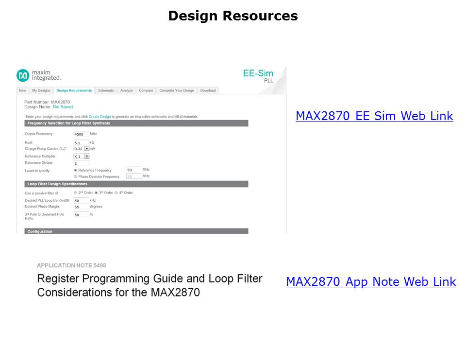 An application note is available to help with register configuration settings and loop filter design tips. Use the web links for navigating to the MAX2870 application note and EE-Sim tool.