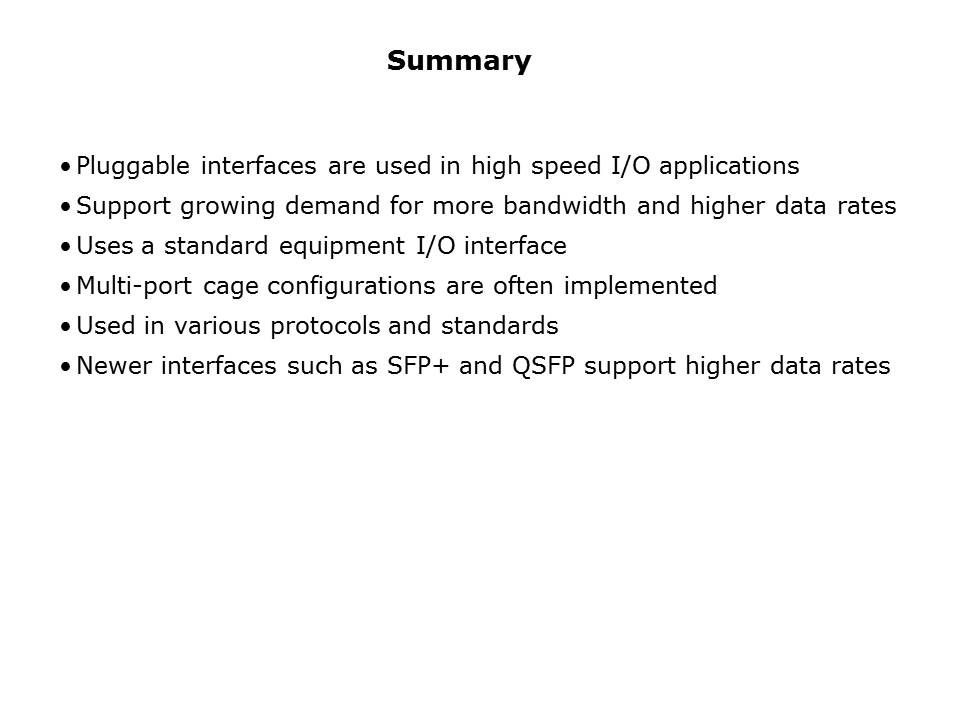 Pluggable interfaces are used in high speed I/O applications to support the growing demand for more bandwidth and higher data transfer rates. It uses a standard equipment I/O interface, the flexibility of pluggable modules and cabling enables options of fiber or copper links, and it supports various data rates and protocols. To increase panel density, multi-port cage configurations are often implemented. Pluggable I/O interfaces are used in various protocols and standards within the networking and storage industries, including Ethernet, Fibre Channel and Infiniband. Newer interfaces such as SFP+ and QSFP were developed to support the higher data rates of these evolving standards.