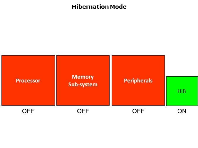 As shown in this diagram, the blocks in red indicate that the processor, memory sub-system, and peripherals are completely powered down, and only the hibernation module, shown in green, remains powered on from an external battery or power supply.