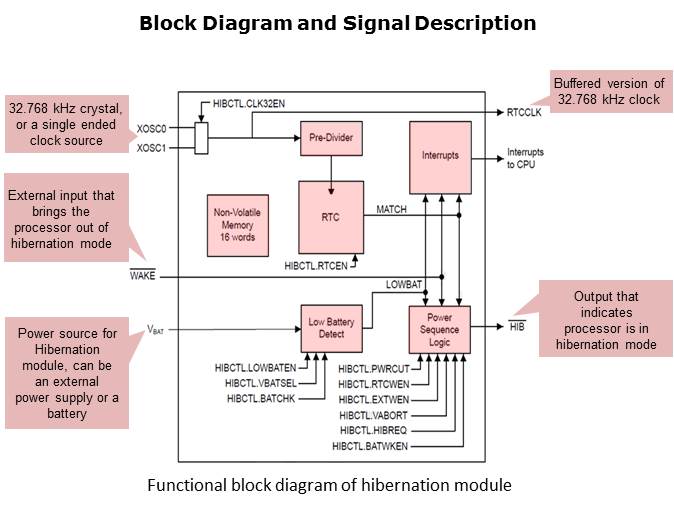 The hibernation module operates on its own clock domain. As shown in the functional block diagram on this slide, it consists of a battery-backed memory, a low battery detection circuit, and power sequence logic. It also has a mechanism to generate interrupts to the CPU. Power to the hibernation module is supplied through VBAT pin which can be directly connected to an external battery or a regulated external power supply. In order to use the hibernation module, a 32.768 kHz single ended clock source, or a 32.768 kHz external crystal is required. The clock source can be connected to XOSC0 pin, leaving XOSC1 pin disconnected, or an external crystal can be connected to XOSC0 and XOSC1 pins. The buffered version of the 32.768 khz clock is available on the RTCCLK pin. In addition to low battery detection and RC match, the processor can wake up based on an external wake signal which can be supplied to the hibernation module through WAKE terminal. Also, HIB pin is provided to indicate the current state of the processor, i.e., if the processor is in hibernation mode or not.