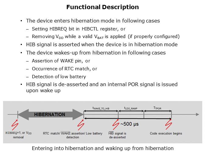 The MCU enters the hibernation mode when the hibernation request bit in the control register is set. The device can also enter the hibernation mode when power is dynamically removed, while Vbat is connected and the registers are configured accordingly. When the MCU is in the hibernation mode, the HIB pin is asserted. This pin can be used to indicate to other external devices that the MCU is in hibernation mode and its core, along with other system peripherals, are powered off. The device will continue to stay in hibernation mode until one of the wake conditions occur. There are three wake conditions; assertion of the external wake signal, occurrence of an RTC match, or detection of low battery on the Vbat terminal. After the device wakes up, HIB pin is de-asserted and an internal power-on reset signal is issued so that the application code can begin to execute.