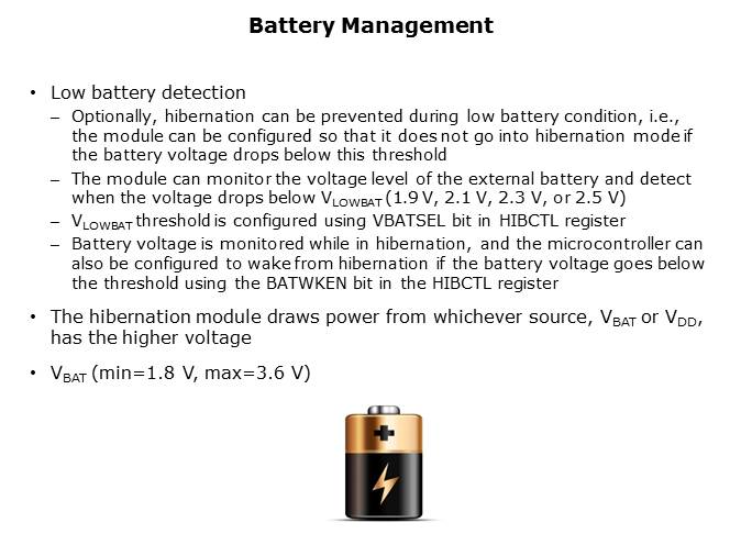 The hibernation module can be independently powered by a battery or an auxiliary power source. The module can monitor the voltage level of the battery and can detect when the voltage drops below VLOWBAT threshold. The voltage threshold can be between 1.9 to 2.5 V, and is configured using VBAT select field in the hibernation control select register. Battery voltage is monitored while in hibernation and the microcontroller can be configured to wake from hibernation if the battery voltage goes below the threshold. The hibernation module can also be configured such that the device does not enter hibernation when the battery voltage falls below the certain threshold. It is important to make sure that VDD is higher than VBATT or the hibernation module will draw power from the external battery and it will be drained.