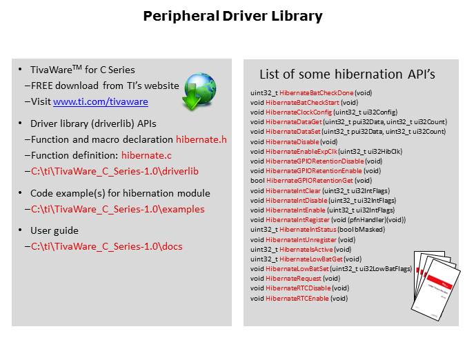 The peripheral driver library in TivaWare™ for C Series includes a set of function calls, commonly known as APIs, which can be used to initialize and configure the hibernation module without having in-depth knowledge of various registers and bit configuration. More details about the functions, including the descriptions, prototypes, arguments, and etc. can be found in the driver library documentation, which is available in the TivaWare for C Series.