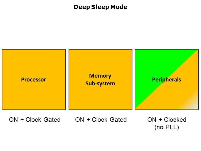 In the diagram shown on this slide, the blocks shown in orange indicate that the processor, memory, and peripherals are powered on, but they are clock gated. The block shown in the shaded green and orange colors indicates that the peripherals are powered on, but they can only be clocked from the internal oscillator.